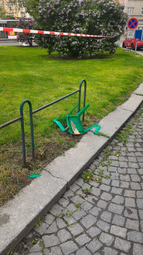 Rozbitá plastikový židle na Basilejskem náměstí.
