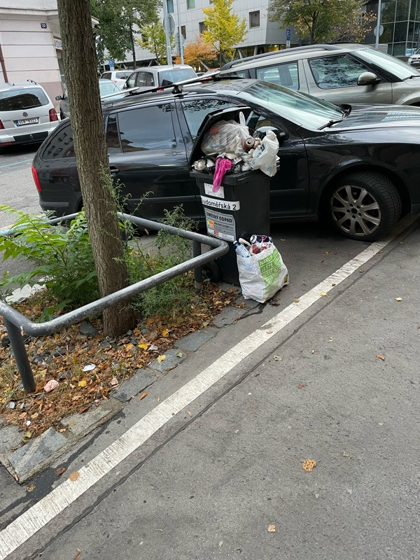 Podle označení popelnice ji někdo odvezl od příslušného domu o dva bloky dál a nechal ji na ulici. Je tu už několik dní a vzniká kolem ní černá skládka.