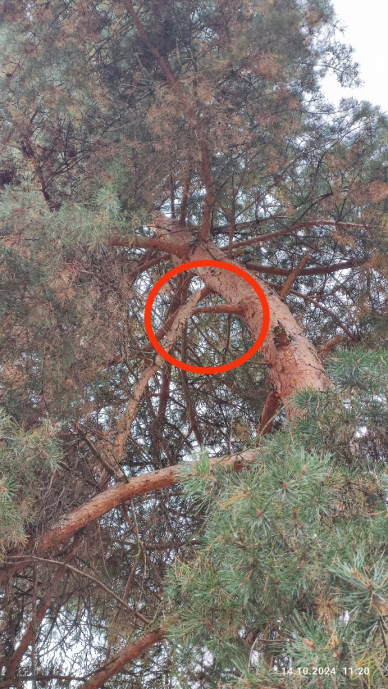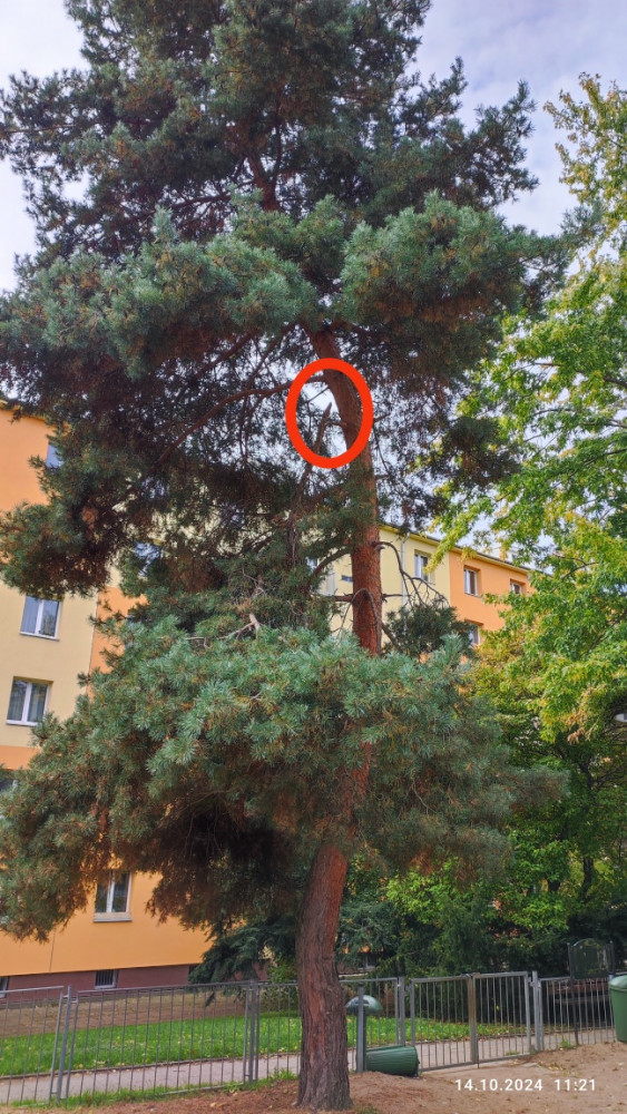 Ulomená větev borovice na dětském hřišti V Jezerách