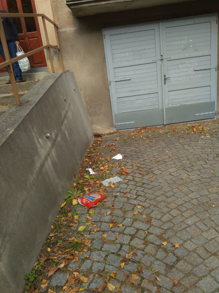 Nepořádek u kontejnerů a před garážemi Pod Lipami 55