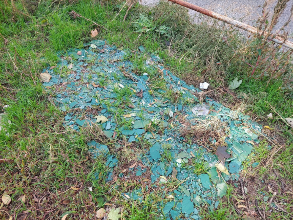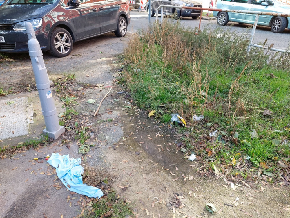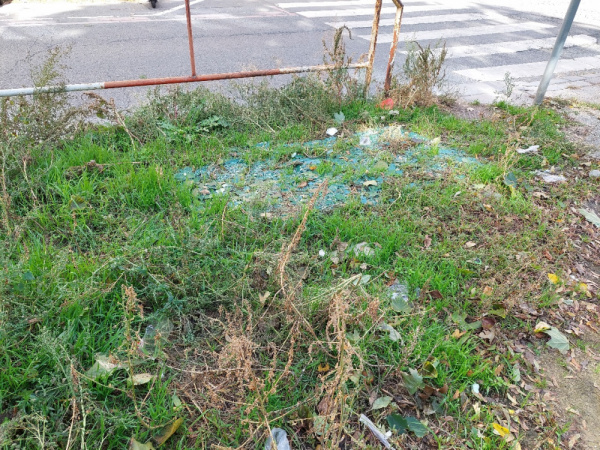 Téměř trvalý nepořádek u schodů do parku,nyní i rozbité sklo u zábradlí.