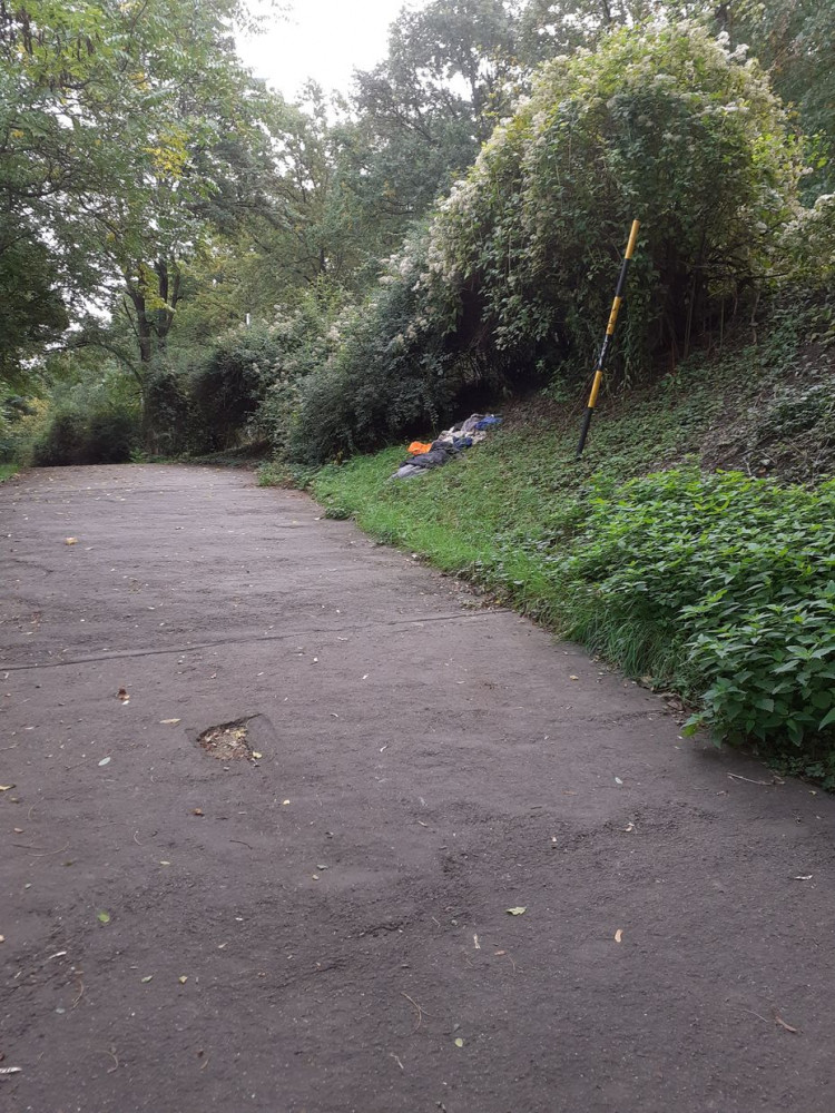 Černá skládka v blízkosti chodníku. Jedná se o oblečení.
