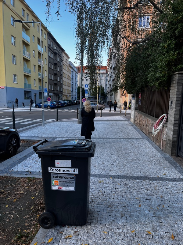 Popelnice z Žerotínovy na špatném místě (roh Ammbrožova a Jeseniova, před Ambrožova 8)