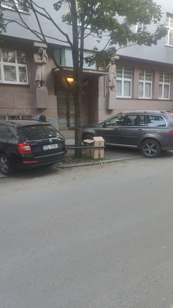 Odložená krabice s odpadky před domem Laubova 1729/8.