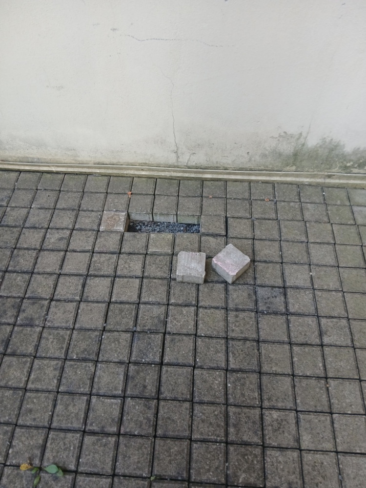 Chybějící kostky v dlažbě, vnitroblok Za žižkovskou vozovnou, za vhcodem Buskupcova 61. Jak chybí jedna koatka, děti to opakovaně rozebírají