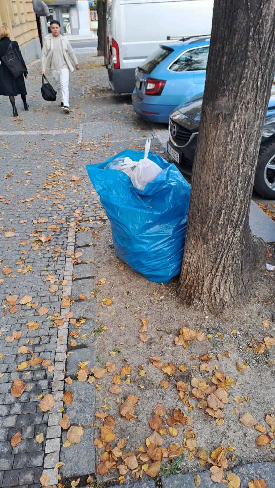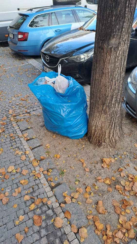 Plný pytel odpadků pohozeny u stromu v naší ulici. Objevil jsem dnes ráno. Včera večer to ještě nebylo.