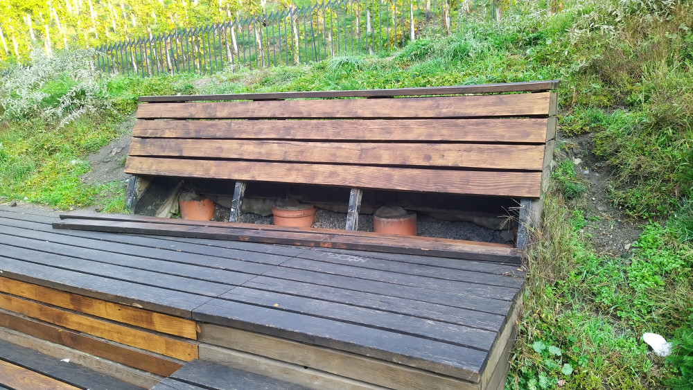 Poškozené dřevěné sezení u cyklostezky Vítkov.
