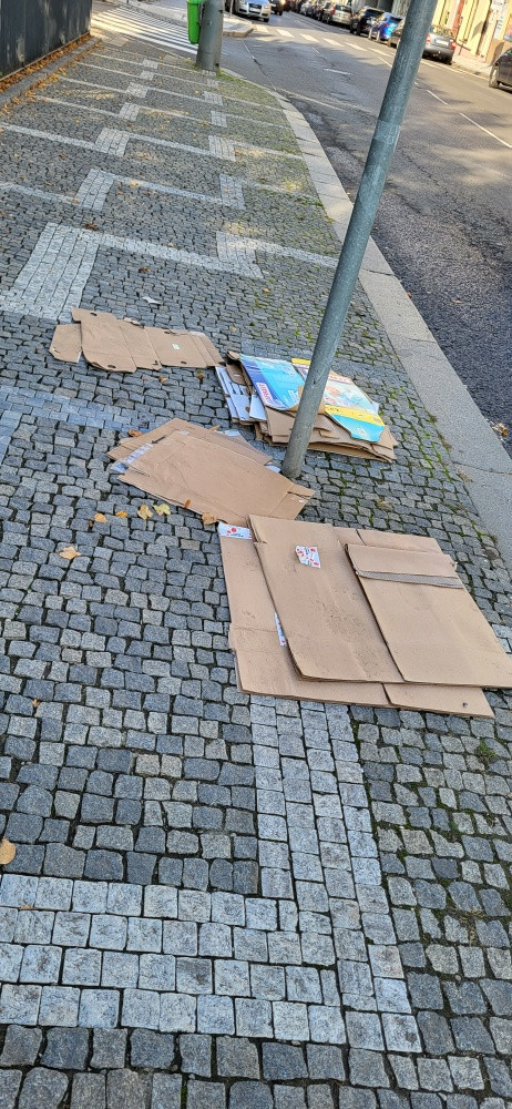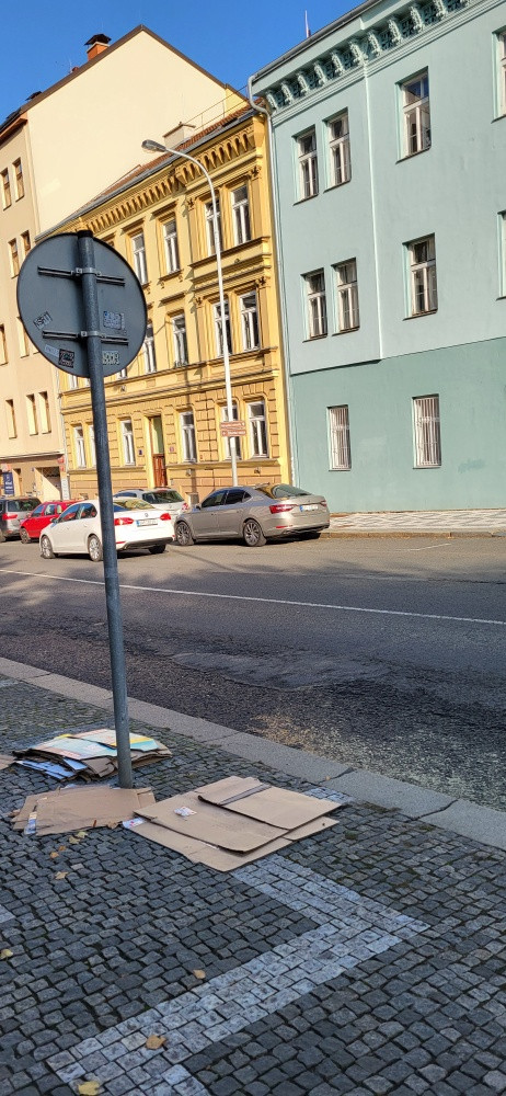 Dobrý den, u Havlíčkova náměstí, naproti domu č.2 jsou u značky "Zákaz odbočení vlevo" pohozené krabice.