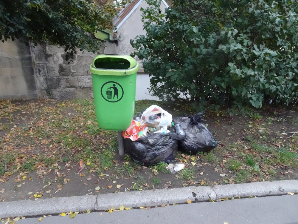 na FLORE vedle nakupniho centra je kos, vedle ktereho jsou 2 velek cerne pytla plne kelimku a odpadu z fast foodu.