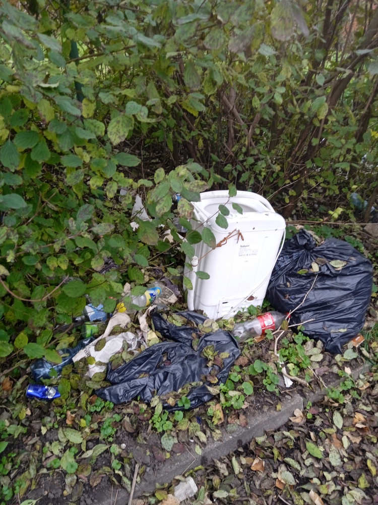 Nepořádek u křoví na parkovišti u bývalé benzínové pumpy Pap oil Habrová 2a cca v půlce parkoviště u křoví