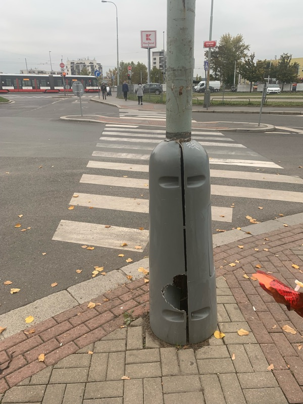 Rozbitá /částečně otevřená spodní část pouliční lampy.