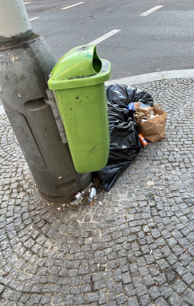 Pohozene odpadky u kose. Dělají to obyvatele domu Slezska 23. Mají velkou popelnici venku na ulici zamčenou, někteří z obyvatel zjevně nemají klíče a odpadky pak pohazuji na ulici.