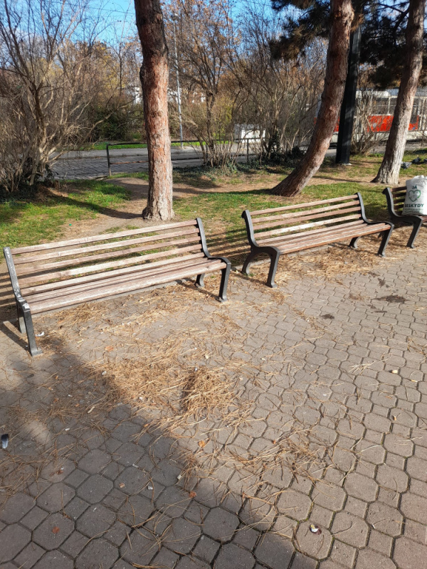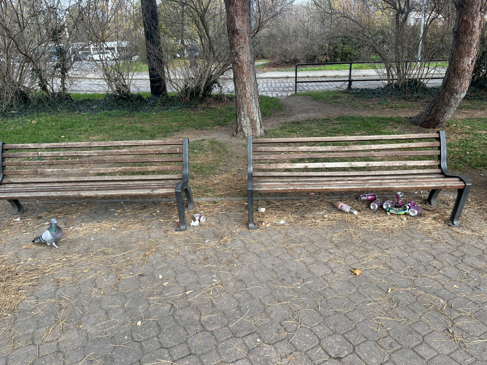 V rohu parku na náměstí Jiřího z Lobkovic je velký nepořádek pod lavičkou a kolem laviček