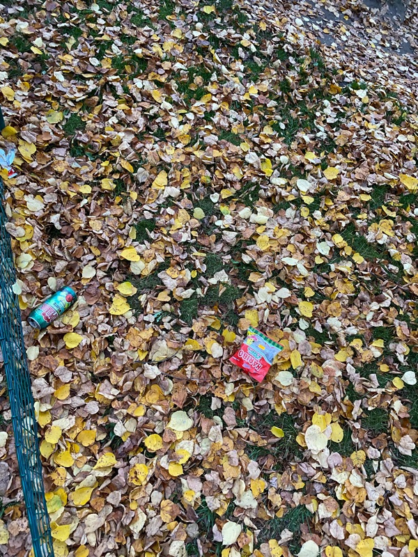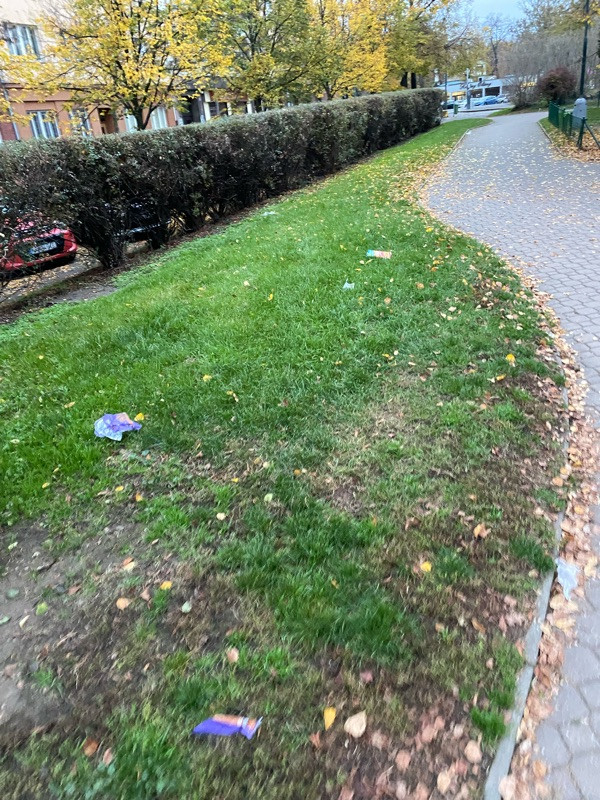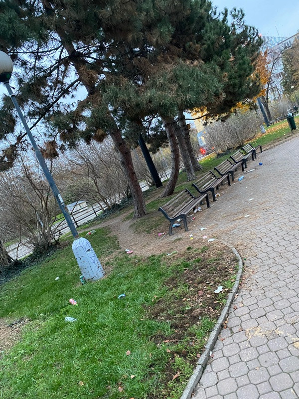 Prostory parku Jiřího z Lobkowic. Kolem těchto a mnoha dalších odpadků prochází každý Všední den dvojice uklízečů, kteří projdou parkem, zaparkuji své popelnice na druhé straně od zastávek a jdou si do místní Žabky nakoupit snídani, posnídají u svých popelnic a odchází dále. Přišla mi však nedůstojné tuto dvojici fotit.