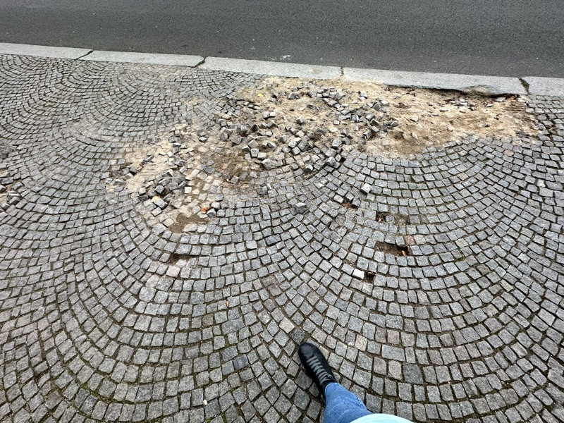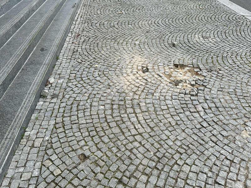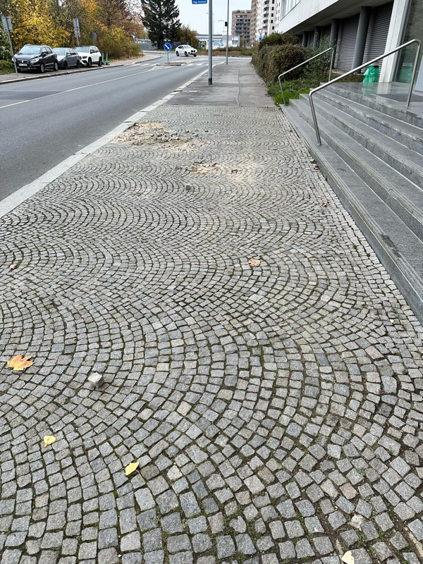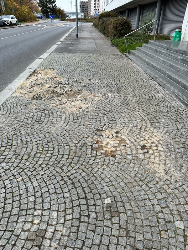 Chodník před Nagano Office budovou je v čím dál tím horším stavu - aktuální foto přiloženo. Kostky jsou každým dnem více a více rozkopány po okolí. Pro některé lidi to může být velice nebezpečné.