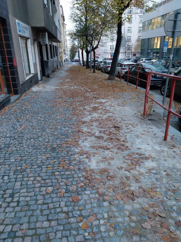 listí na chodniku a pod tím rozkopsny chodník a volné kostky
