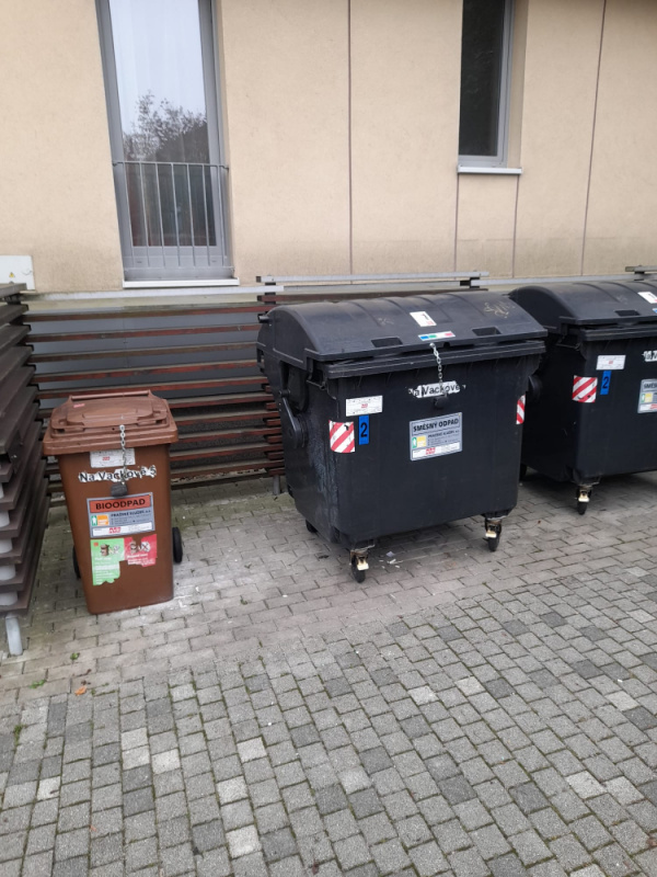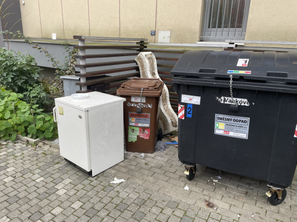 Lednice a jiné velké odpadky u kontejnerů na smíšený odpad.
