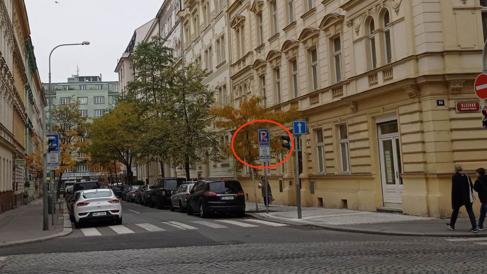 Na křižovatce Perunova x Slezská se nachází DZ "vyhrazené parkoviště," která je přelepena oranžovou zneplatňující páskou a to navzdory nulové stavební činnosti v okolí. Prosím o odstranění pásky.