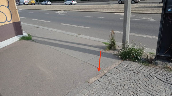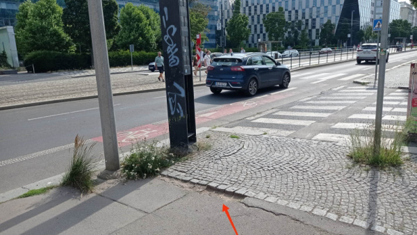 V ulici Vinohradská se u lampy 301 655 nachází díra v povrchu chodníku v přechodu mezi dlažbou a asfaltem.