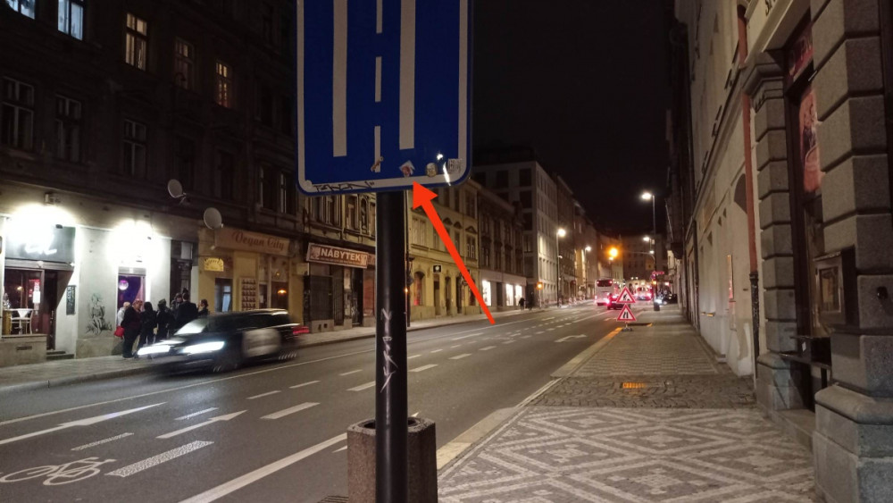 V ulici Husitská je na lampě 300 378 deska DZ polepená množstvím samolepek.