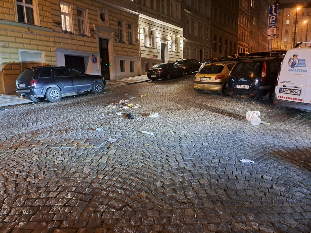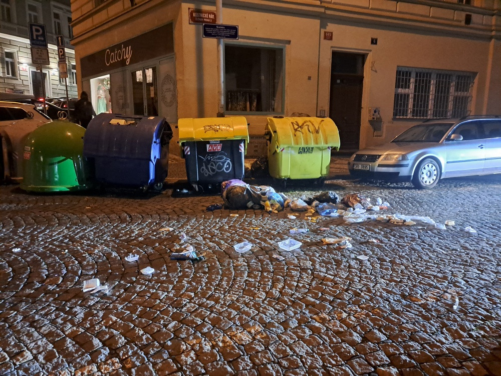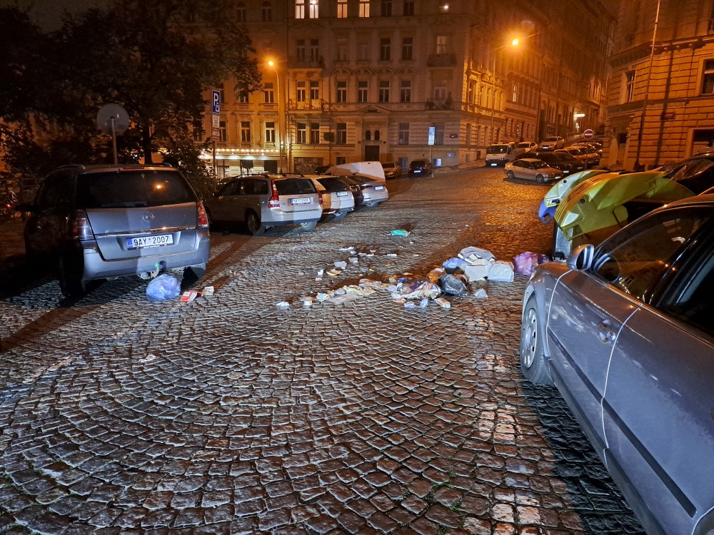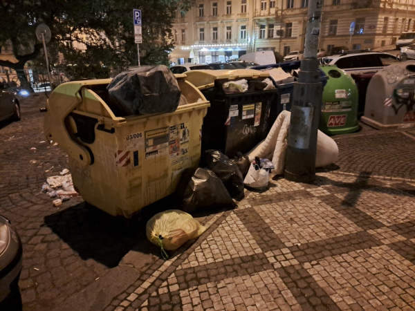 Poházené odpadky kolem sběrných kontejnerů a na ulici.