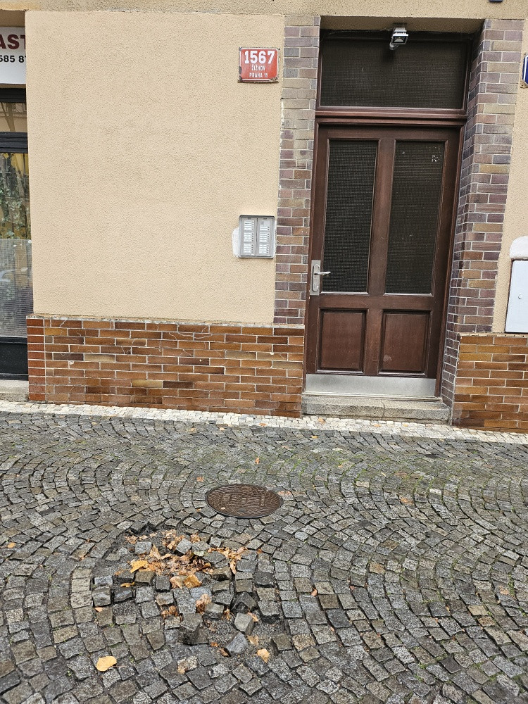Dosti porušená dlažba chodníku před vstupem do domu Roháčova 1567/82 Moc prosíme o opravu....