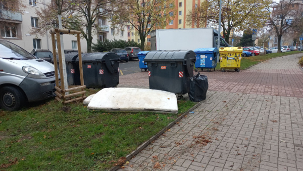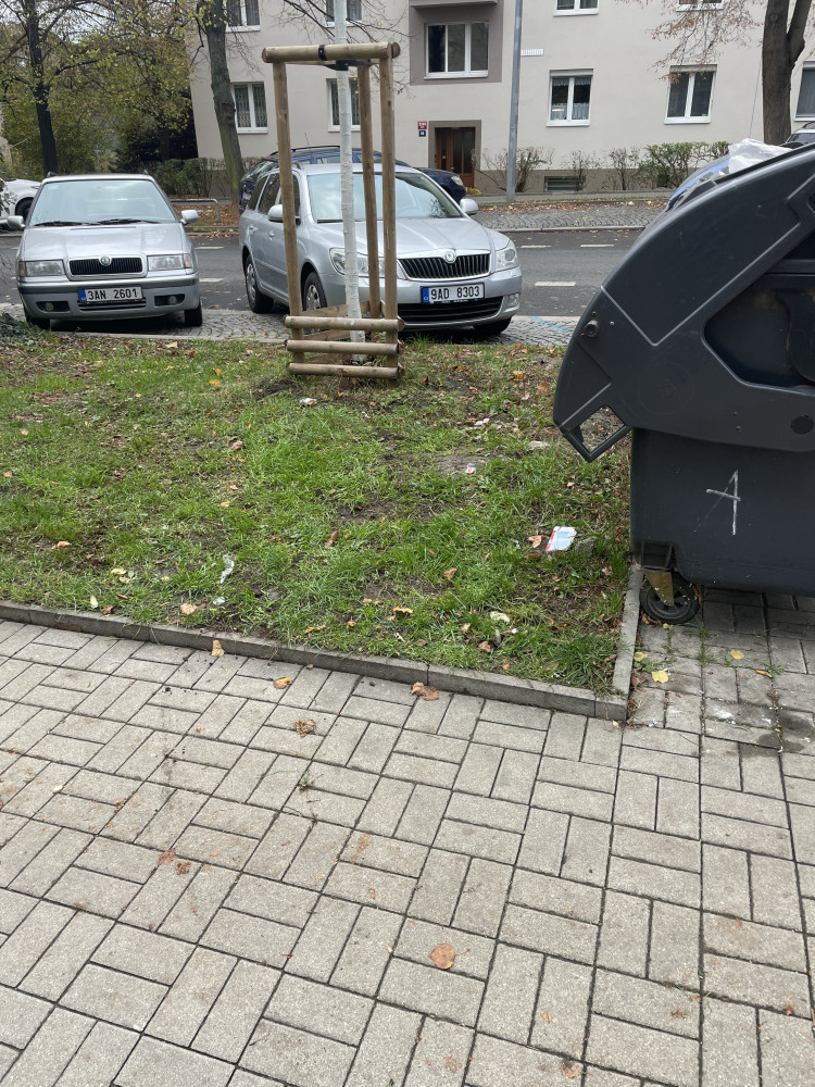 Nepořádek kolem kontejnerů na odpad, vyhozené velké předměty: Před kolejemi, Pod Lipami 43.