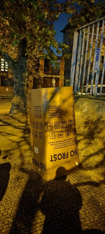 Na rohu ulice si nekdo vybalil bily spotrebic a krabici se vsim tam nechal