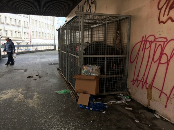 Nepořádek a rozbité sklo u kontajnerů v Kubelikove ulici u prodejny Albert, za rohem od vchodu do domu Kubelikova 60.