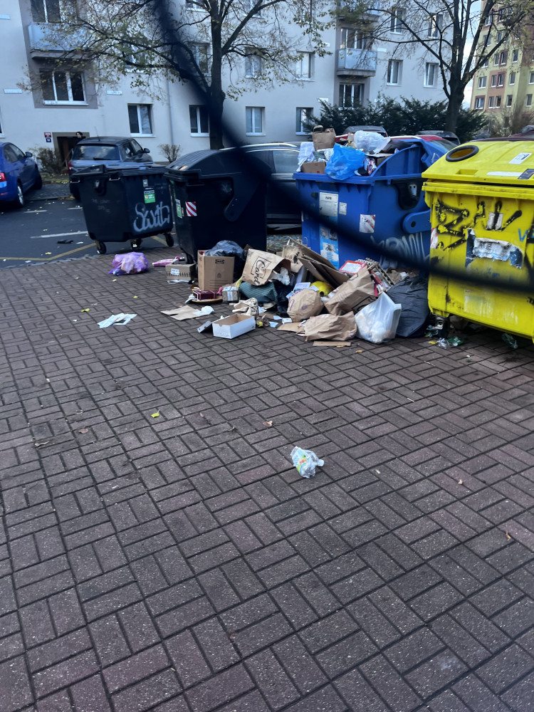 Dobrý den, za pořádek okolo popelnice je odpovědný vlastník nádoby. V případě popelnic na směsný odpad ( černé nádoby ) to bývá zpravidla majitel přilehlého domu, jehož adresa je vylepena na popelnici. -V podobných případech se obracejte přímo na něho, případně na hygienickou stanici, nebo na policii... Děkujeme za pochopení Marek Čistá Trojka