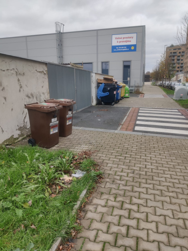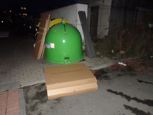 V ulici Zverinova u kontejenru na trideny odpad jsou vyhozeen drevotriskove desky (asi bocnice postele). Dlae kartony od nabytku a stary dreveny stolek.