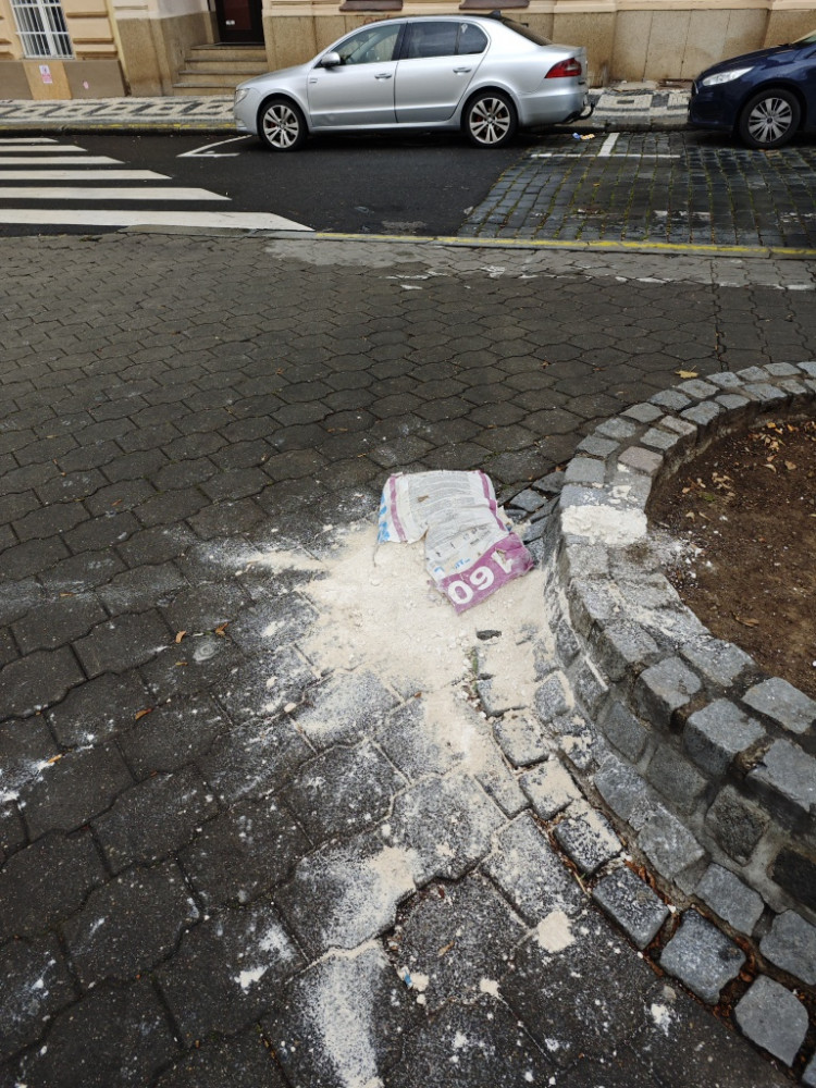 rozsypaný pytel s cementem nebo něčím podobným