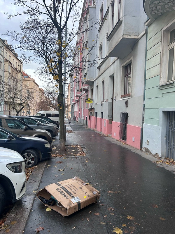 Válející se krabice už měsíc na ulici-Kubelíkova 34.