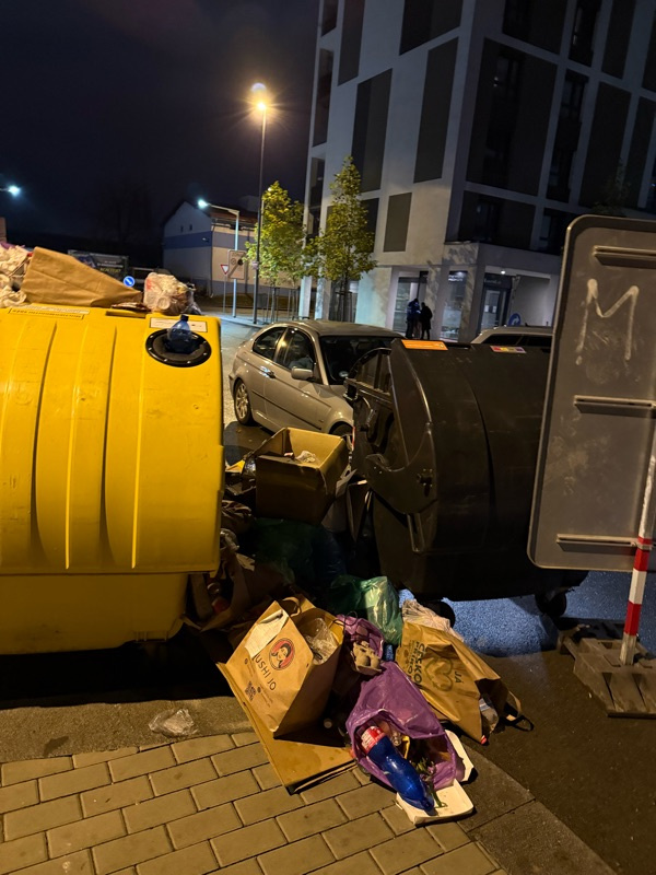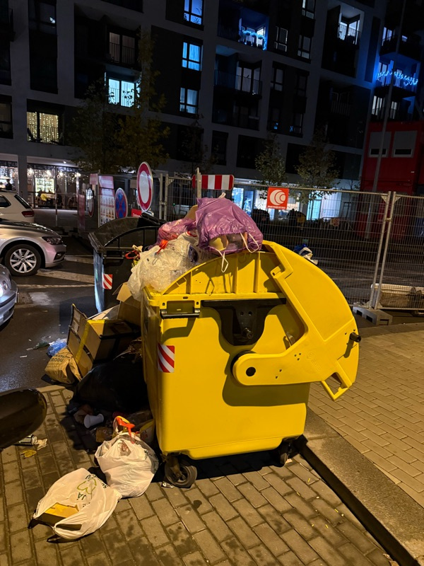 Nepořádek okolo plných kontejnerů na odpad, malé množství nádob na odpad v ulici a neustále plné kontejnery tříděného odpadu