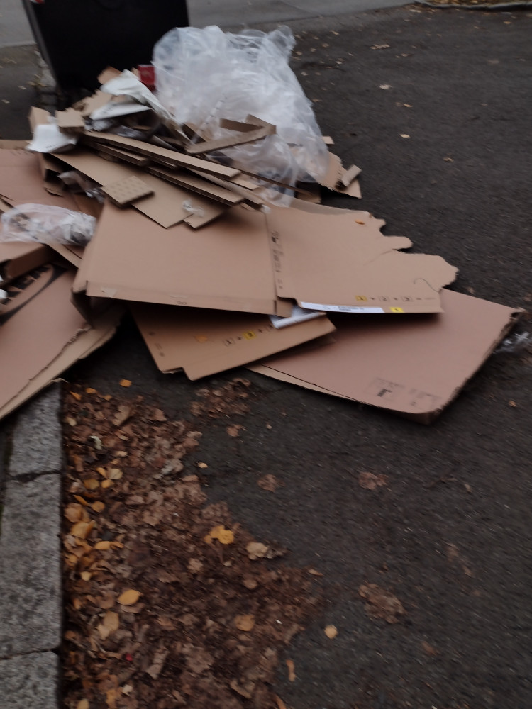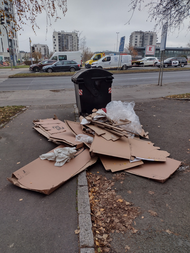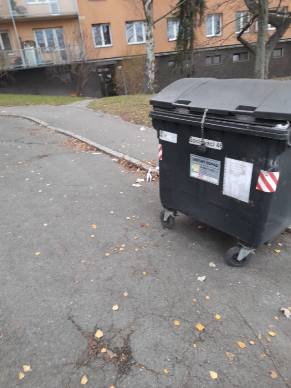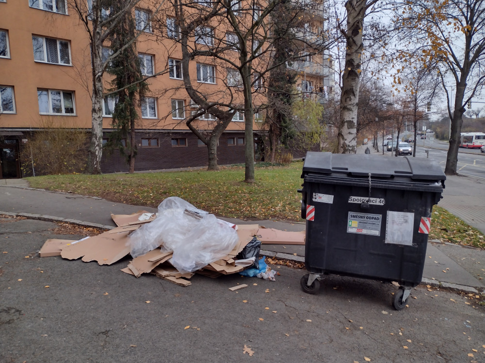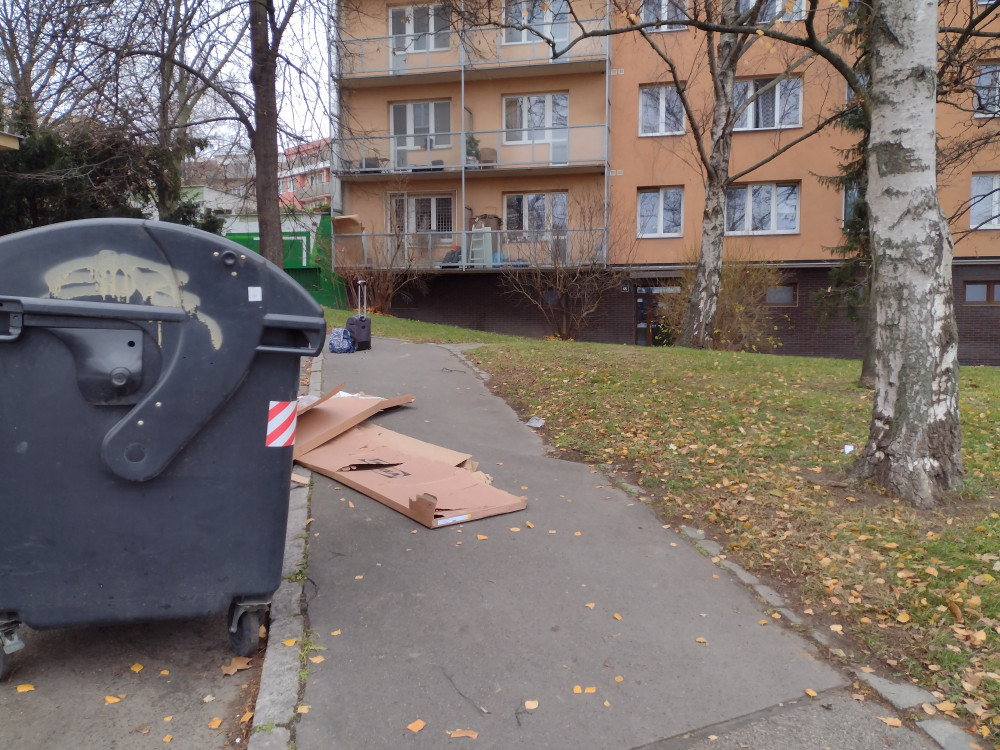 Kontejner mezi oběma domy, kde je Bytové družstvo Žižkov předsedou výboru společenství