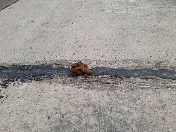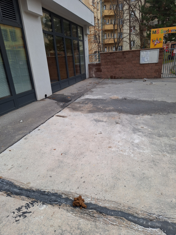 Opakovaně neuklizené psí exkrementy velkých rozměrů v zadním traktu rekonstruovaného domu Táboritská 26 před vstupem do MŠ a do cvičebního sálu Centra aktivit pro seniory (REMEDIUM Praha).