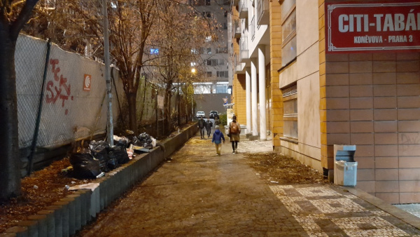 veliký nepořádek v průchodu za Billou, mezi Hartigovou a Rohačovou ulici
