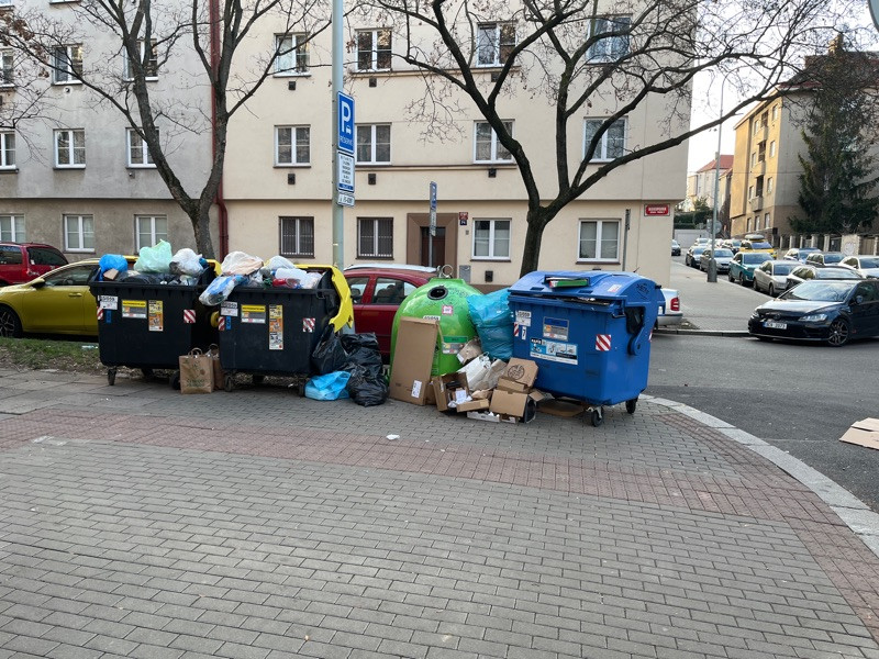 Včera nevyvezený papír přetéká. Přestože se ma v sobotu vyvážet.