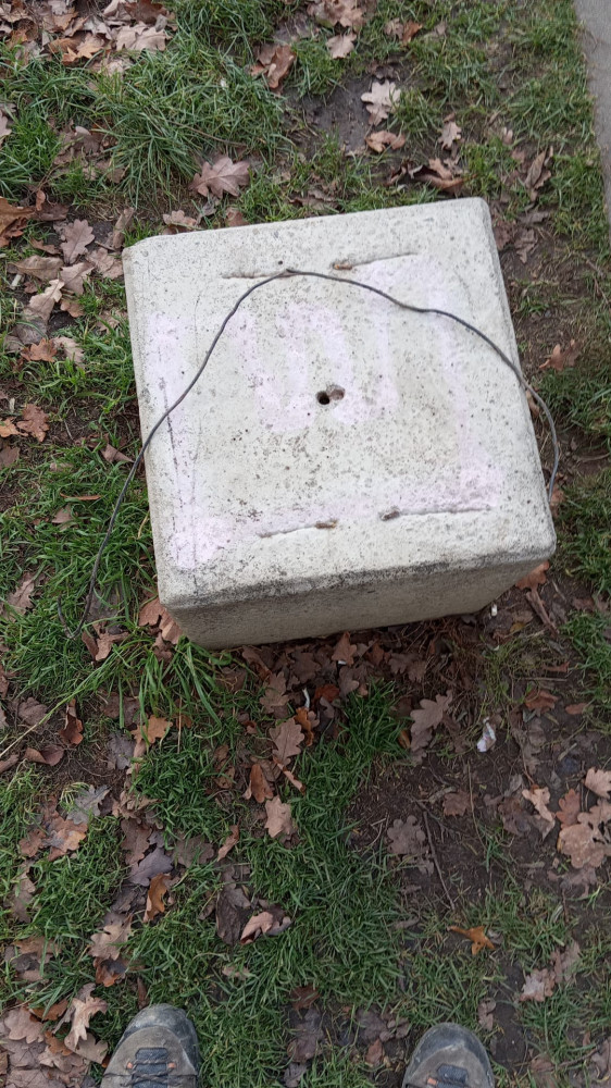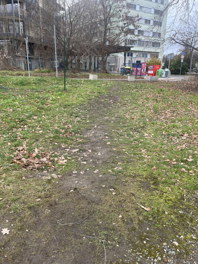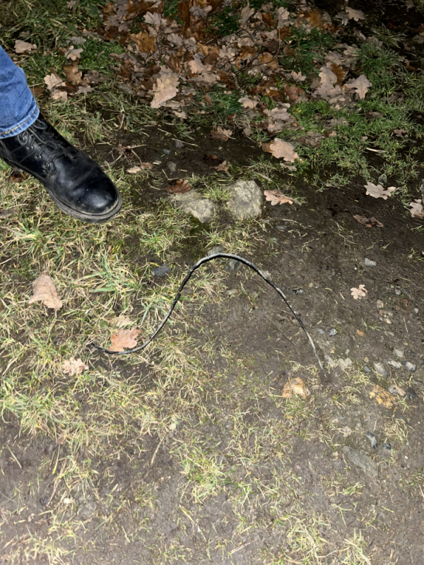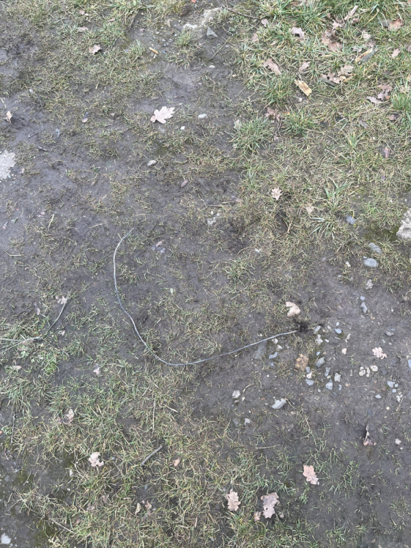 Trčící drát v zemi u vstupu do parku na Pitterove. Včera večer bylo z drátu uděláno oko dnes někdo vytrhl a trčí ze země. Děkuji za odstranění.