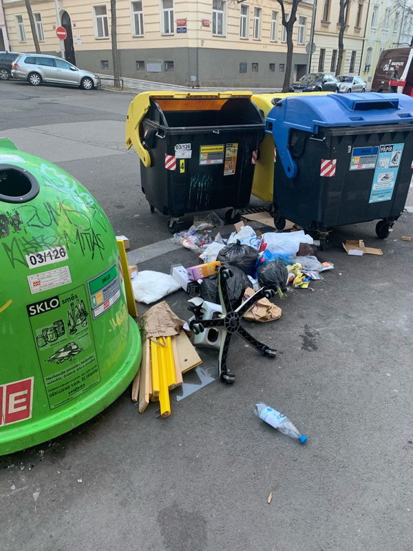 U kontejneru na rohu Zerotinovy a Domazlicke je opakovane neporadek sahajici az do vozovky a to zejmena po vyvozu popelari. Haldy odpadu valejici se po zemi, smesny odpad v kontejnerech na trideny odpad.
