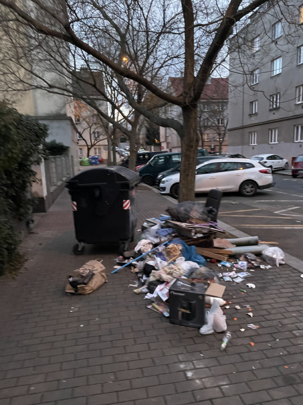 Dobrý den, za pořádek okolo popelnice je odpovědný vlastník nádoby. V případě popelnic na směsný odpad ( černé nádoby ) to bývá zpravidla majitel přilehlého domu, jehož adresa je vylepena na popelnici. -V podobných případech se obracejte přímo na něho, případně na hygienickou stanici, nebo na policii... Děkujeme za pochopení Marek Čistá Trojka