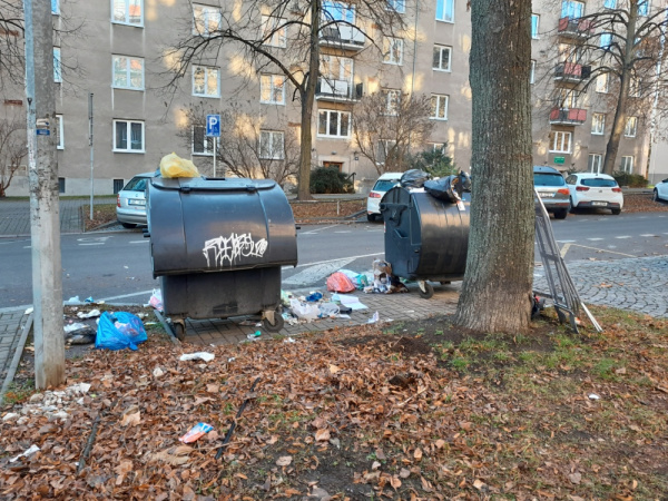 Kontejnery jsou přeplněné, odpadky vypadávají ven a jsou rozházené až do silnice.