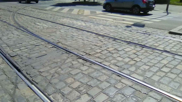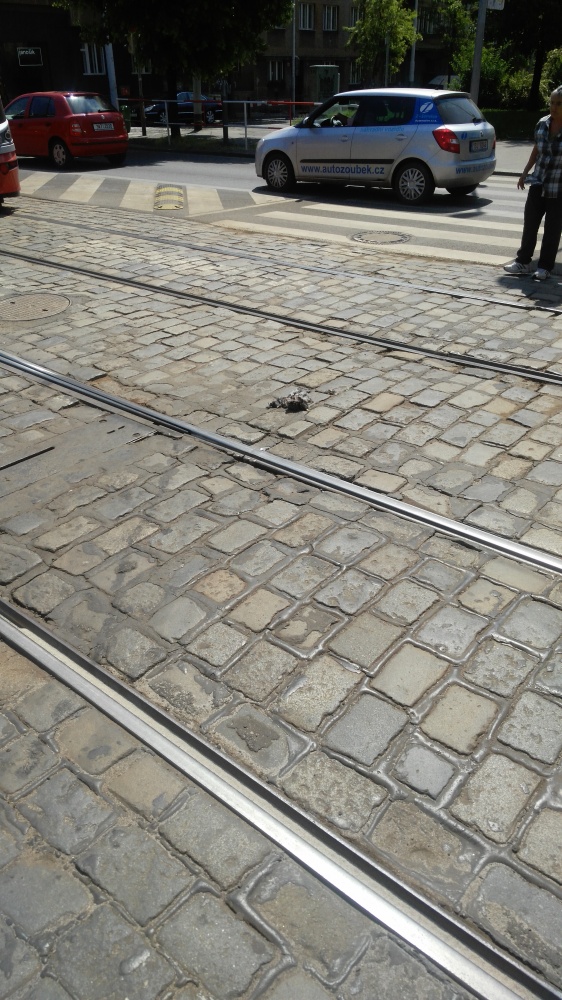 Na přechodu pro chodce u vchodu do Olšan. Hřbitova leží už týden mrtvý holub.