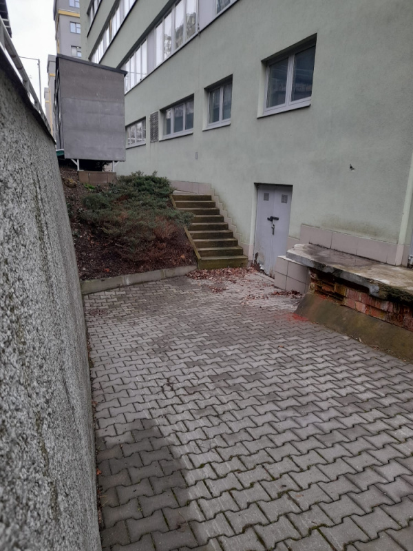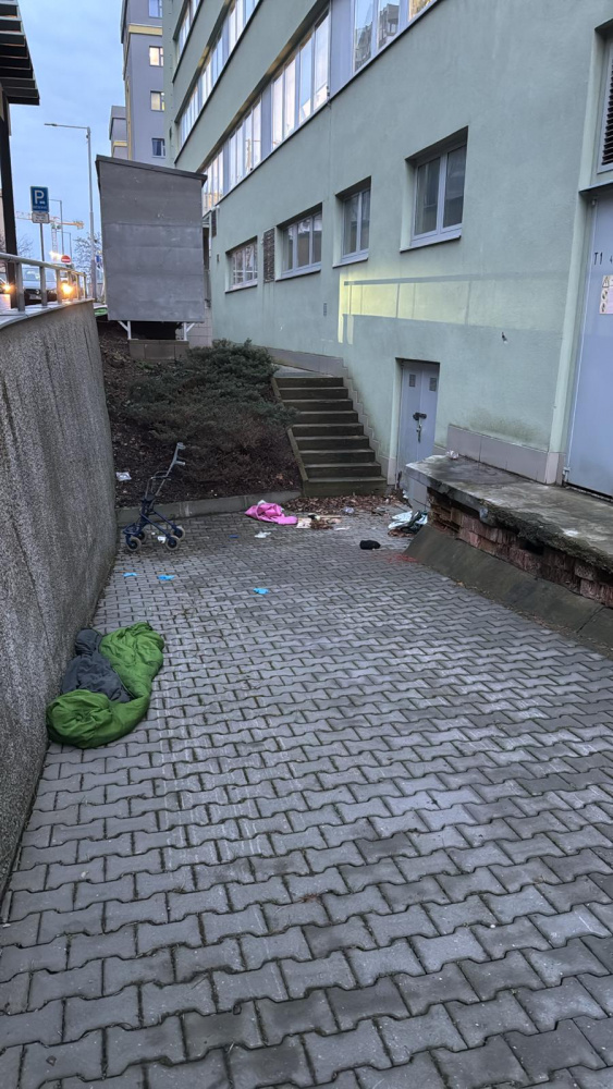 Olšanská 7 ze zadní části domu je nepořádek po bezdomovci.