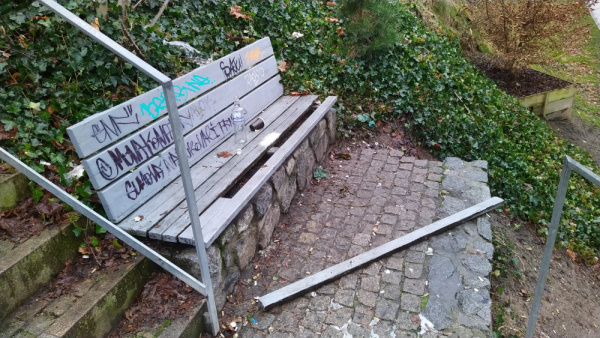 Poškozená lavička u schodů z Lukášovy ulice na cyklostezku.