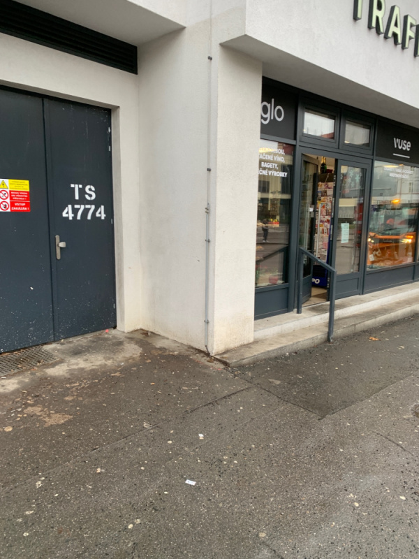 na chodníku v rohu u rozvodny elektřiny vedle trafiky