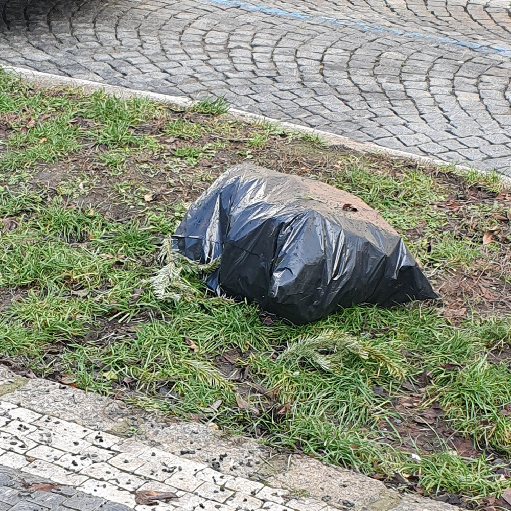 Vyhozený černý pytel s rozřezaným stromkem Zapomenutá dopravní značka.