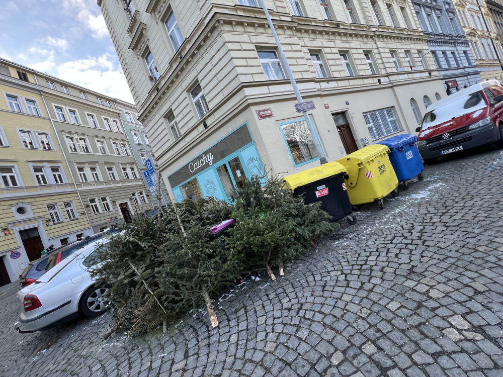 Prosím o úklid vánočních stromků, leží to tam od pátku večer a brání to špatnému průjezdu s kočárkem.