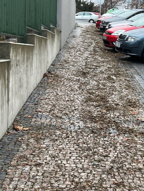 jsme MŠ nám. Jiřiho z Lobkovic 23/119. Bohužel se před naší MŠ v ulici Nám. Jiřího z Lobkovic neuklízí. Před ZŠ ano, ale k nám dolů z kopce ne. Chodník je dlaždičkový, je na něm neustále spadané listí a to velmi klouže, zvláště v tomto období, kdy chodník namrzá . Pro všechny, kdo jdou k nám do MŠ, tedy hlavně rodiče s dětmi a zaměstnance MŠ, je tento neuklizený chodník nebezpečný a již evidujeme několik úrazů.