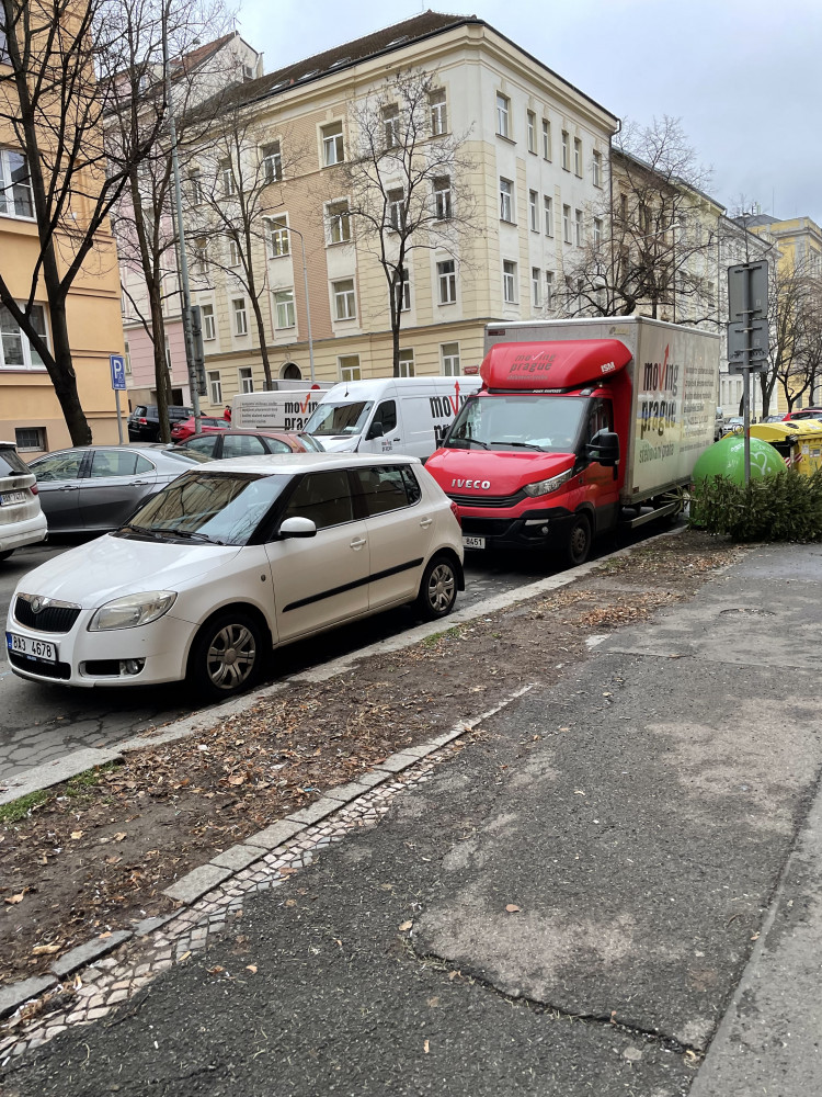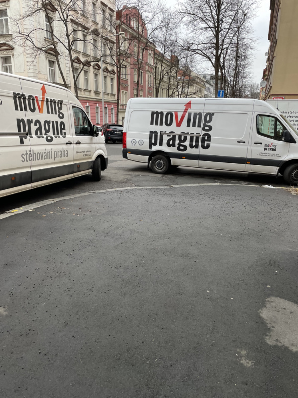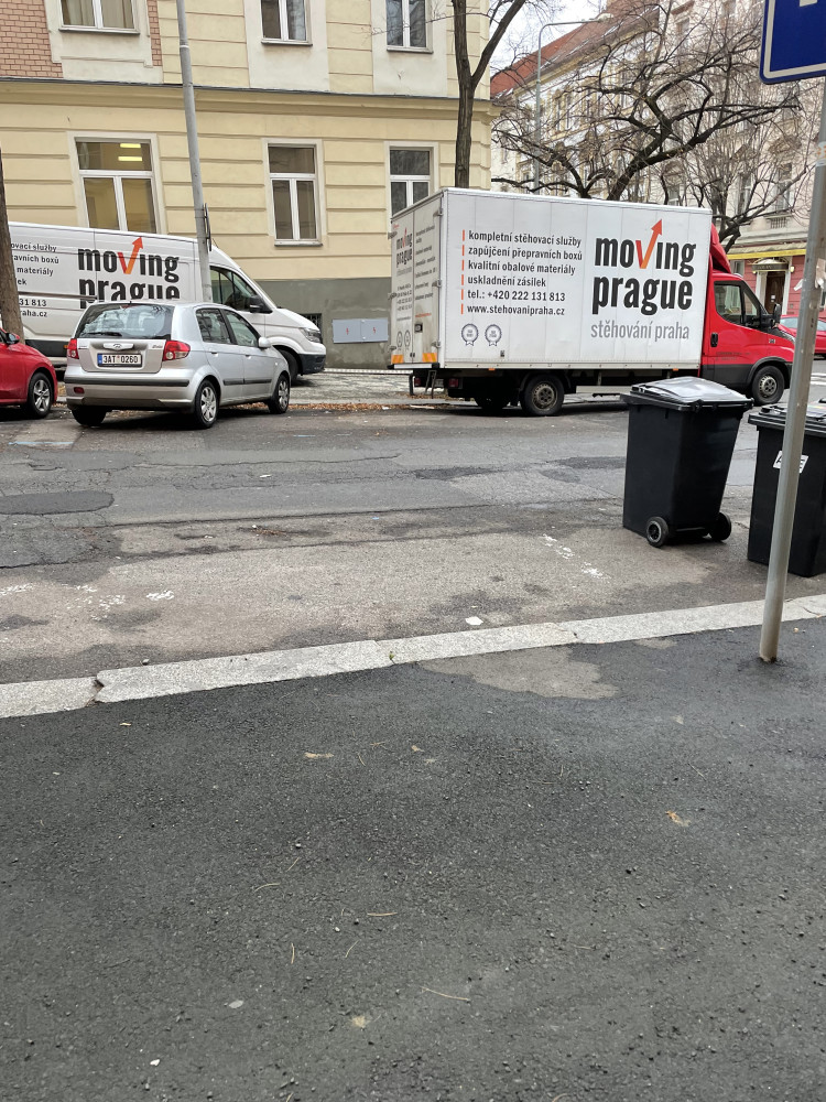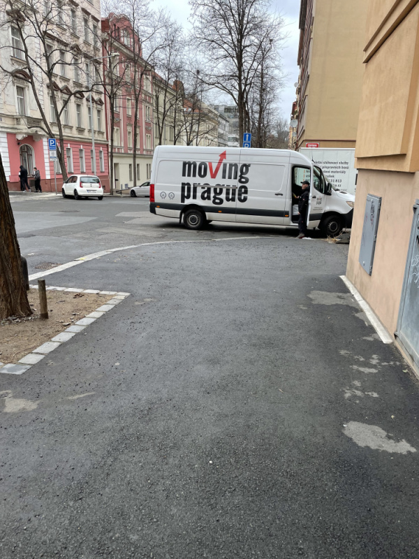 na křižovatce Domažlická x Žerotínova od rána parkuji vozy, které brání chodcům k přechodu ulice, patrně mají stěhovat v domě Domažlická 5 (?), ale vozy jsou rozmístěné všude kolem, na chodníku a na križovatce, nic se zatím nestěhuje. Prosím o zjednání nápravy. Nemí kudy chodit